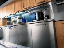 Til køkkenforkle er derfor fliser et ideelt valg. For ikke at bruge for mange penge anbefales det at begrænse dig selv til et par rækker med fliser. Ovenfor er det anbragt dekorativt gips. Men på samme tid skal vi huske, at i det indre metal og træ skal lak og glas kombineres så kompetent som muligt.