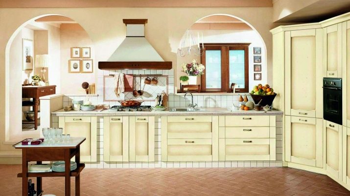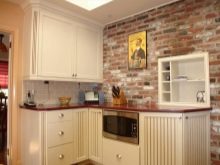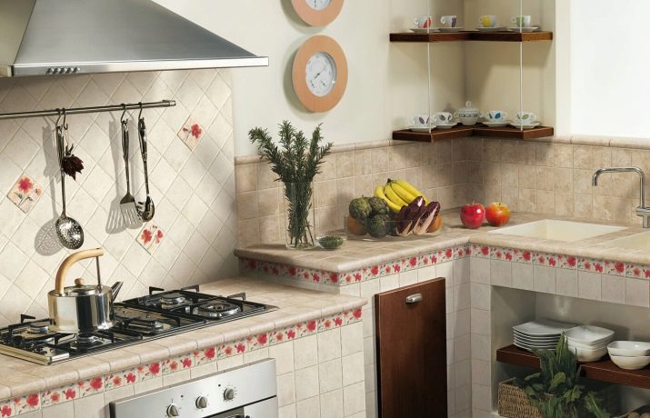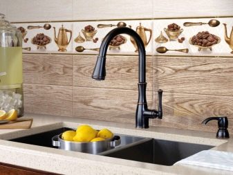 Der er specielle række køkkener, der bruger heterogen keramik, suppleret med relieffdetaljer. Disse typer af fliser kan ikke være de vigtigste i rummet. Som kant- og dekorationsindsatser er de imidlertid usædvanligt velegnet. Keramik bruges også til møblering mod møbler. Denne løsning tillader maskering af svulmende hjørner, der ikke kan fjernes i henhold til sikkerhedsstandarder.