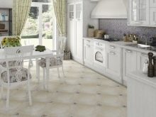 Oftest er gulvet i køkkenet dækket med keramiske fliser. Det er kun nødvendigt at overveje, at den skal svare til hovedskyggen. For at sikre, at gulvet ikke er for koldt, anvendes afmonterede varmesystemer. Fliser skal kun vælges med en skridsikker overfladebehandling. Uanset om køkkenet er lavet med eller uden en bar, er trægulve populært.