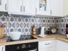 Men du kan ikke placere MDF over selve ovnen. Derudover ser selv de bedste eksempler på sådanne paneler ikke for naturlige ud. Derfor foretrækker det store flertal af designere og almindelige kunder ikke at rod med paneler af nogen art, men at bruge keramiske fliser i ånd af patchwork. Forskellen kan relateres til form, ornament, type mønstre og farver. Med alle forskellene i fliserne skal de imidlertid kombineres harmonisk med hinanden.