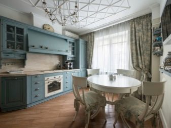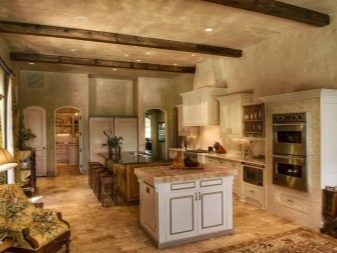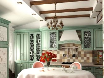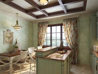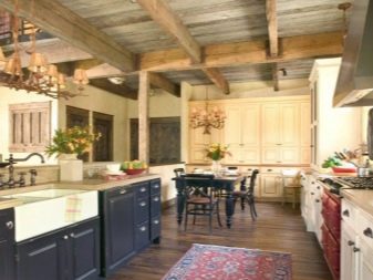 Hvis lofterne i det provencalske køkken er lavet af træ, bør der foretrækkes uforarbejdede overflader. I det mindste bør de bevare det naturlige teksturmønster. Men der er stadig provencalske hængslede konstruktioner. De monteres meget hurtigere end pudsning. Og installationen af gipsplader tager længere tid.