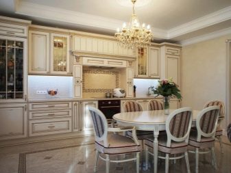 Porcelæn og træ bruges til at dekorere inventar. Sørg for at fremhæve den centrale zone med lys. Den huser en stor lysekrone, der indeholder mange pærer. Men vi må ikke glemme ekstra laveffektlamper med et diffust spektrum. For at belyse fjerne steder skal du bruge:
