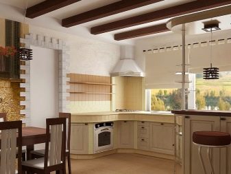 Når man dekorerer lofter i provencalske køkkener, bruges ofte massive træbjælker. Vigtigt: dette element har kun dekorativ betydning og kan ikke bruges som bærende struktur. Husk, at bjælker kun bruges i værelser med højt til loftet. Hvis du planlægger at integrere projektører, er et GKL-loft i to niveauer et fremragende valg.