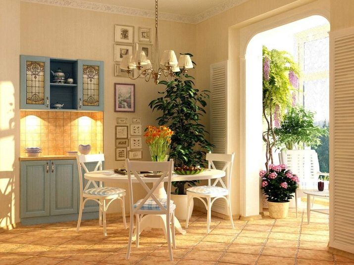 For at oprette et komplet billede anbefales det at lægge en mønstret dug på bordet. Du skal også tage højde for nuancerne ved brug af indendøre blomster i det provencalske interiør. Du kan anvende dem næsten ubegrænset. Planter med smuk blomstring passer bedst. Valget mellem det eksotiske og de kulturer, der er almindeligt for vores breddegrader, hviler på ejerne selv.