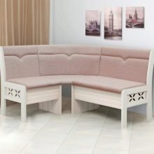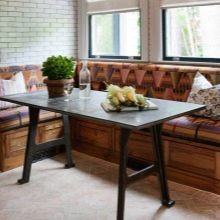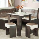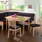 - Corner. Den mest almindelige mulighed bestående af to bænke, der er indbyrdes forbundet. Efter område tager de lidt plads og fylder hjørnet. Et bord i en hvilken som helst form kan kombineres eller kontrasteres i farve, have et lyst omslag lavet af glas eller fotoudskrivning.