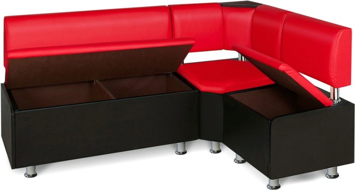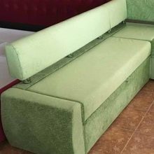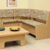 - For et lille køkken er det bedre at købe sofamodeller med en rummelig skuffe til opbevaring af små ting. Klapstole eller små afføring, der er let at rengøre under bordet, sparer plads.
