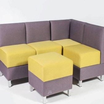 For individuelle ordrer kan designere oprette modulært system. En sofa i et sådant hjørne består af flere sæder og puber, der er sammenføjet i forskellige sekvenser. Om nødvendigt kan du udvide spisepladsen eller gøre den mere kompakt og flytte den under en anden væg på få minutter.