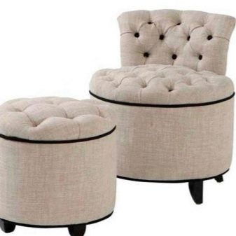 - Stole eller afføring. De er lavet af det samme materiale og fortsætter stilen med køkkenhjørnet. Ofte suppleres et sæt med en miniatyr Ottoman med blødt polstring.