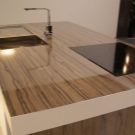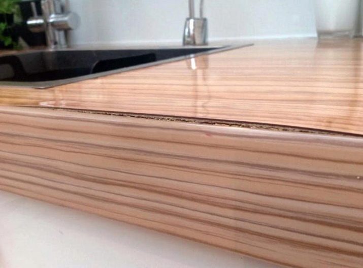 - Finer. Denne mulighed for laminering kunne værdsættes meget, hvis den var så praktisk som den er smuk.Finéren er lagt oven på spånpladen, alt lakeres ovenpå, så den færdige bordplade ser ud til at være et naturligt massivt træ og ser simpelthen fantastisk ud. På samme tid er produktet overhovedet ikke forskellig i fugtbestandighed, og det er også meget let at ridse det, for i køkkener findes denne efterbehandlingsmulighed ikke ofte.