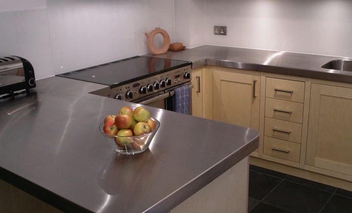 - Rustfrit stål. Det er måske ikke helt korrekt at kalde et sådant materiale et laminat, og alligevel kan de beskæres med spånplade-bordplader. Med den rigtige tilgang til design kan dette se temmelig pænt ud, derudover er det også meget praktisk, men en sådan løsning vil koste kunden ganske dyrt, fordi indstillingen normalt kun er passende på offentlige steder.