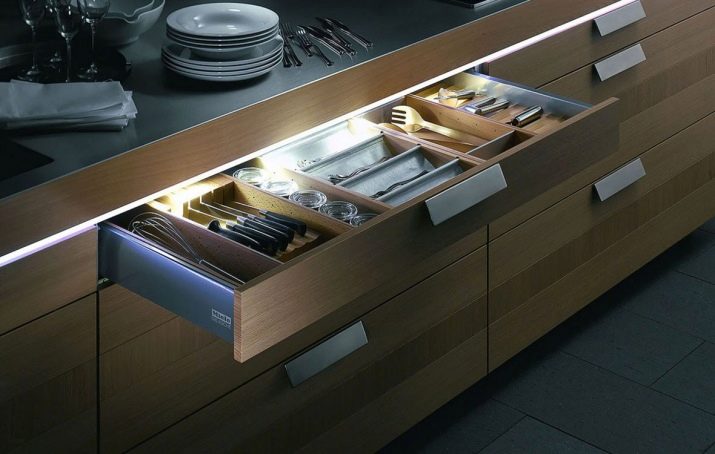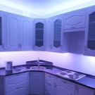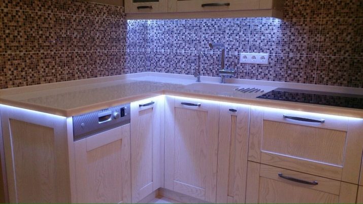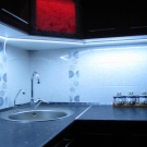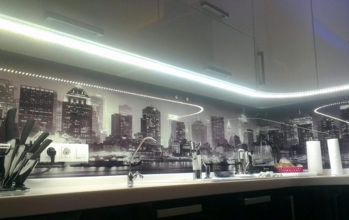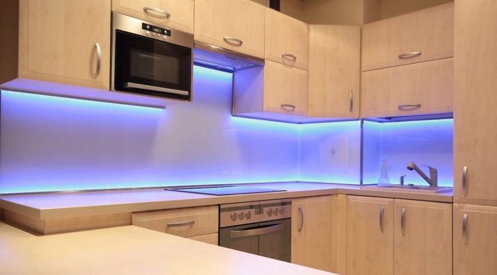 LED-strimlen til køkkenet, fordelt på arbejdsområdet, er en fremragende løsning til værelser, hvis design er implementeret i både klassisk og moderne stilarter.