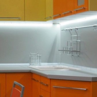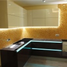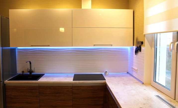 I dette tilfælde anvendes belysningen af arbejdsområdet, falske LED-strimler er placeret langs kanten af bunden af vægskabe, der reflekterer effektivt i et forklæde af glas.