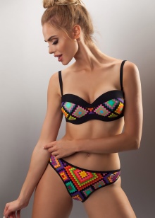 - Bikinier, der længe er blevet klassikere af en separat badedragt. Den består af en top, der kan præsenteres i forskellige former og trusser. Sidstnævnte kan også variere i form. De mest almindelige er trusser, glip eller indstillinger, der er bundet på siderne. For fit piger, der ikke lider af komplekser, er kopier med thongs egnede.