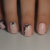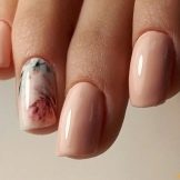 Slider design er en reel fund for manikyr. På få minutter giver det dig mulighed for at dekorere accentnaglerne i en manikyr med grundlæggende beige lak. For ikke at miste effekten af udtryksevne er det med en kort længde værd at bruge klistermærker af applikationstype på et transparent underlag. De er mindre og ser pænere ud.