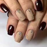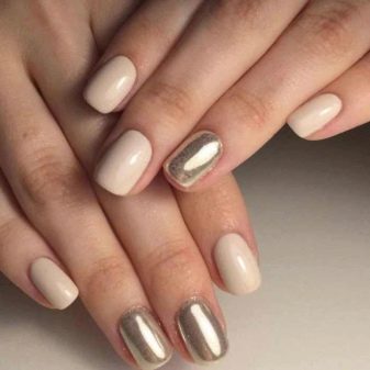 I betragtning af at en gylden eller sølvsprøjtning i dag er velkommen, kan du kombinere beige gelpolering med dem. Hvis du gør det rigtigt, vil guld eller sølv se ganske harmonisk ud ikke kun om aftenen, men også i det daglige sæt. Andre harmoniske duetter inkluderer kombinationer af beige lak med blå, blomme, rødbeder. Disse mørke farver i dag vil sandsynligvis være de bedste kontraster til den beige base.
