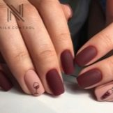 Ud over hvid kan du fremhæve flere negle af beige manikyr med sort lak eller gel. Han har ingen følelsesladet farve, og vil derfor ikke begrænse det kvindelige image i udvalget af tilbehør og smykker. I dette tilfælde bør den sorte ledsager ikke dominere. Hvis manikyren muligvis ikke passer ind i den strenge ramme for dresskoden, er livlige kombinationer mulige, som inkluderer blandinger af beige med rød, orange, dybgrøn, vin, bordeaux, lilla, marsalovy.