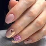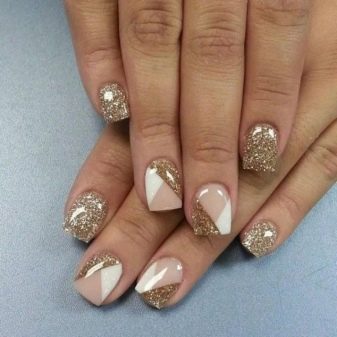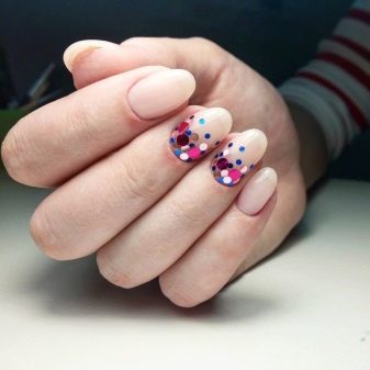 Kamifubuki bør, ligesom designet med rhinestones, doseres i en kort længde og beige base. På samme tid er det uønsket at bruge et stort sæt flerfarvede konfetti, da de øjeblikkeligt vil henvise til nytårsindretningen. I stedet for den ombre effekt, som er mulig på en kort længde med en langstrakt negleplade, er det værd at prikke indretningen. For eksempel kan de lægge en lodret lod på kontraststrimlen på aksentspikeren.