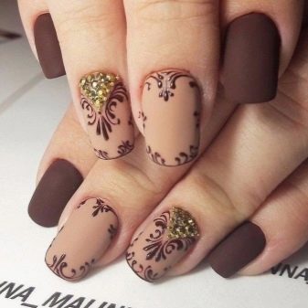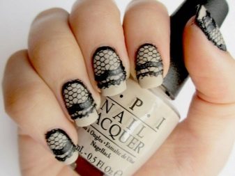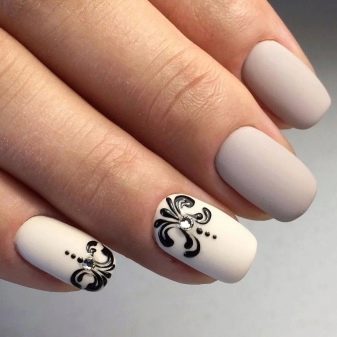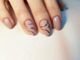 Du kan male dine negle med beige lak, og vælg en sløreteknik til accenter. På en gennemsigtig kontrastbasis kan du tegne monogrammer eller blonder. For at få dem til at se omfangsrige ud, kan du lave tegningen med toppen og derefter drysse den med akrylpulver. Et sådant design vil se smuk ud og status. Dog kun hvis vægten ikke kloner hinanden, og der ikke er mere end tre.
