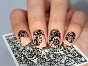 Hvad angår udsmykningsteknikker er kamifubuki, glitter, geler, gnider, akrylsukker, håndmalet, skyderdesign og stempling perfekte til beige manikyr. Hvis vi betragter stempling som det vigtigste designværktøj, er det vigtigt at vælge plader med et lille indgraveret tryk., da en stor visuelt gør korte negle uudtagelige. På samme tid vil små blonder eller monogrammer på kanterne af neglene, der imiterer en slags fransk, se ganske harmoniske ud i kort længde.