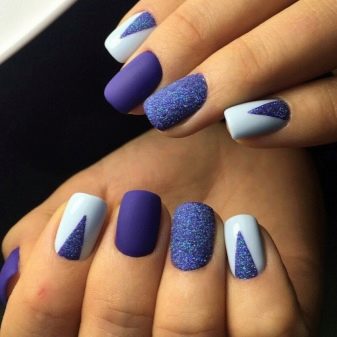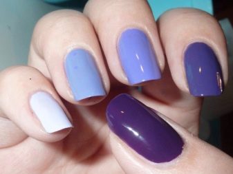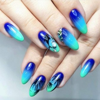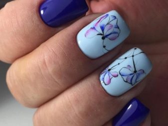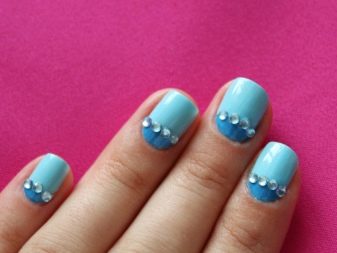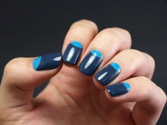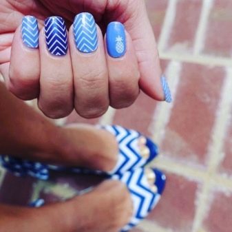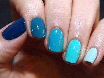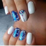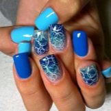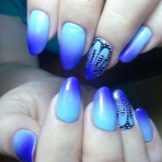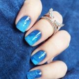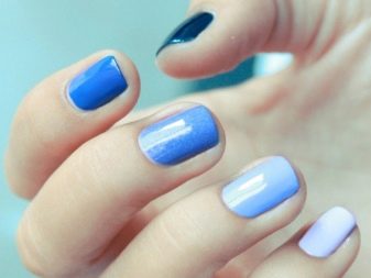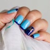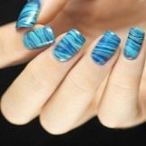 Gennem den ene er neglene malet i en blå farvetone, og de resterende i blå. Et sådant design anbefales kun til meget unge piger, der kan lide at eksperimentere med billeder.