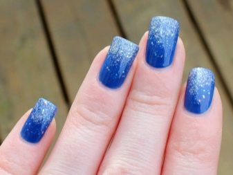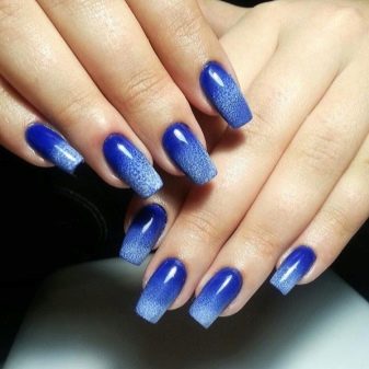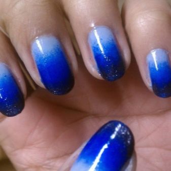 Ombre er en almindelig mulighed, som unge piger vælger. Det ser meget flot ud på lange og mellemlange negle. Overgangen fra mørkeblå til blå kan udføres både fra top til bund og vice versa. Hvidt kan bruges som en ekstra farve. I dette tilfælde flyder mættet blåt glat i blåt og derefter til hvidt.