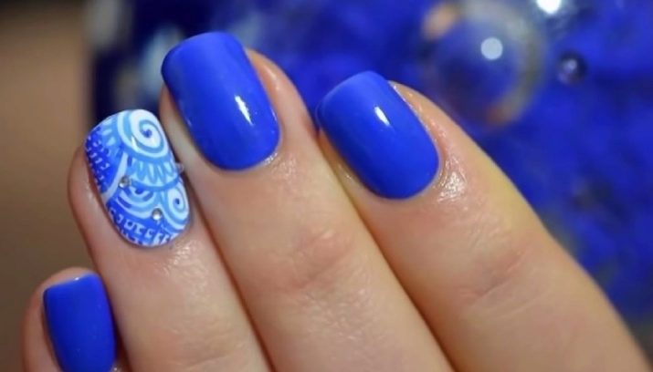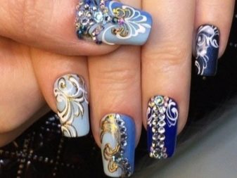 Negeldesign i blå toner er lige så velegnet til både blide romantiske kvinder og lyse piger med et kontrastfarvet udseende. Og blondiner med blå øjne og brunetter med brune ser organisk ud med en lignende farvepalet. Smykker i dette tilfælde bør vælges blandt sølv eller hvidt guld, da kolde toner er bedre kombineret med blå nuancer. Harmoniserer perfekt en sådan manikyr perfekt med topaser eller blå safirer.
