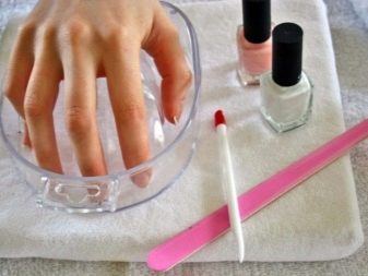 Umiddelbart før påføring af lakken skal der udføres forberedende arbejde. Først fjernes den forrige farve fra neglene. Derefter skal du dyppe fingrene i et varmt sæbebad i ti minutter, tør det af med et håndklæde. Derefter skal du ved hjælp af en neglefil give neglene den ønskede form og flytte neglebåndet med orange sticks.