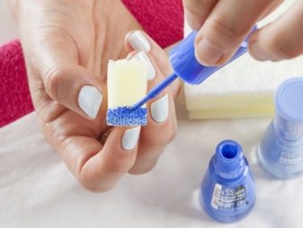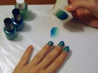 For at skabe en lignende effekt skal neglepladen smøres med en gennemsigtig base, så det næste lag er glattere. Et lille stykke svamp skal males i blåt og blåt, og læg dem oven på hinanden. Derefter påføres svampen på fingeren, som om du overfører din tegning til overfladen af neglen.