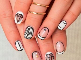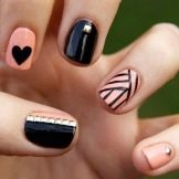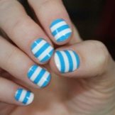 Det geometriske mønster vil være en af de foretrukne muligheder for kreative mennesker, der kan lide at udtrykke sig og ved, hvordan man korrekt kombinerer farver. Det oprettes ved hjælp af stencils eller en tynd børste. Du kan tegne vandrette, lodrette, diagonale, zigzag-striber på pladen. Når du bruger en stencil, er det nok at installere det på neglen, bestemme bredden på strimlen og anvende den ønskede lak. I dette tilfælde er det kun professionelle mestre, der bruger en tynd børste. Først tegner de grænserne på striberne og maler derefter over indersiden.