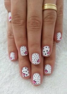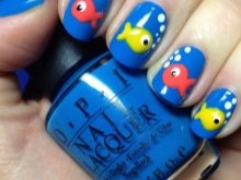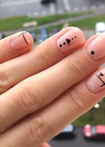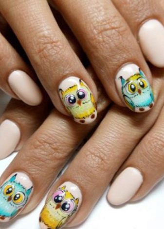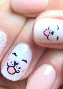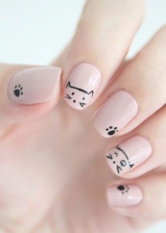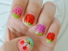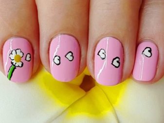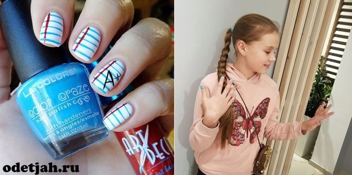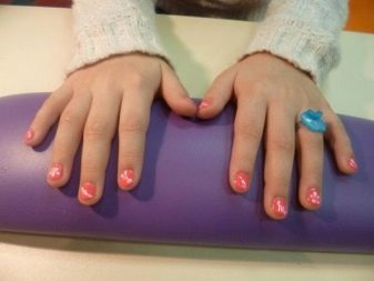 I dette tilfælde kan du give fantasi et omfang. En manikyr udføres med en række tegninger, afhængigt af datterens ønsker. Billedet påføres enten med en nål eller med en tynd børste. På negle kan du skildre hjerter, blomster, bær og endda tegneseriefigurer.
