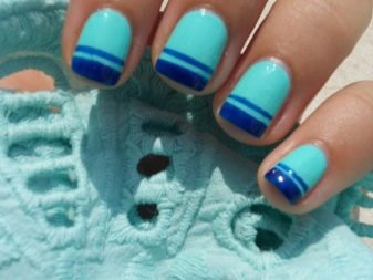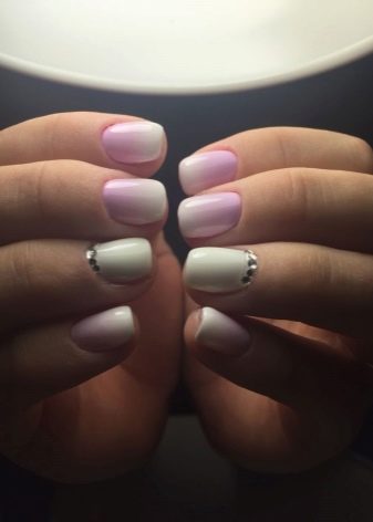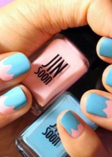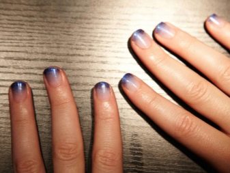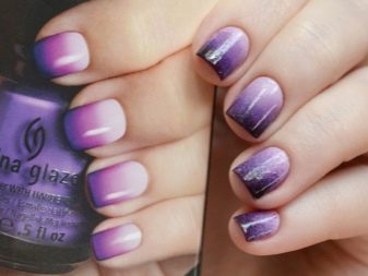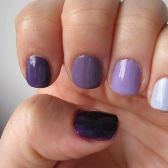 Den anden mulighed foreslår at skifte fra en farve til en anden og gradvist ændre tonen på fingrene. For eksempel kan miniaturebilledet males i lilla, indekset i lilla, det midterste i syrin, det navnløse i pastelrosa og lillefingeren i en mere mættet farve. En anden mulighed involverer gradvis lysning af tonen. Det vil sige, at den mørkeste farveskygge påføres tommelfingeren, og en nuance, der er lidt lysere end den forrige, påføres hver efterfølgende finger. Det viser sig meget originalt.