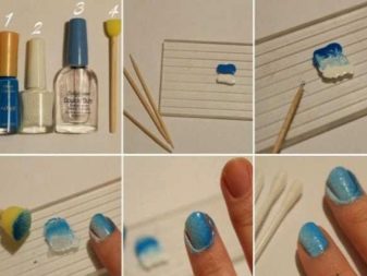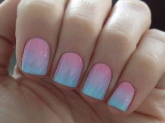 Den første indebærer en ombre på hver finger. De ønskede nuancer påføres svampestykket, hvorefter tegningen overføres til neglepladen. Overgangen kan være både fra mørk til lys og tilfældig. Overgangen fra hindbær til lyserosa eller fra violet til syrin ser meget smuk ud på børns kuglepenne. Nogle mennesker foretrækker at kombinere tre farver på én gang, for eksempel lyserød, blå og kanarie eller syrin, mynte og hvid. Det hele afhænger af teenagers fantasi.