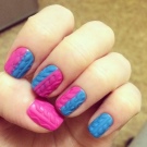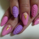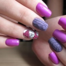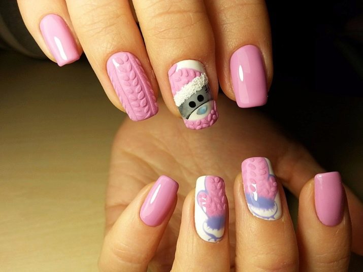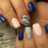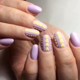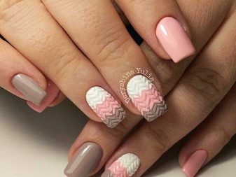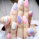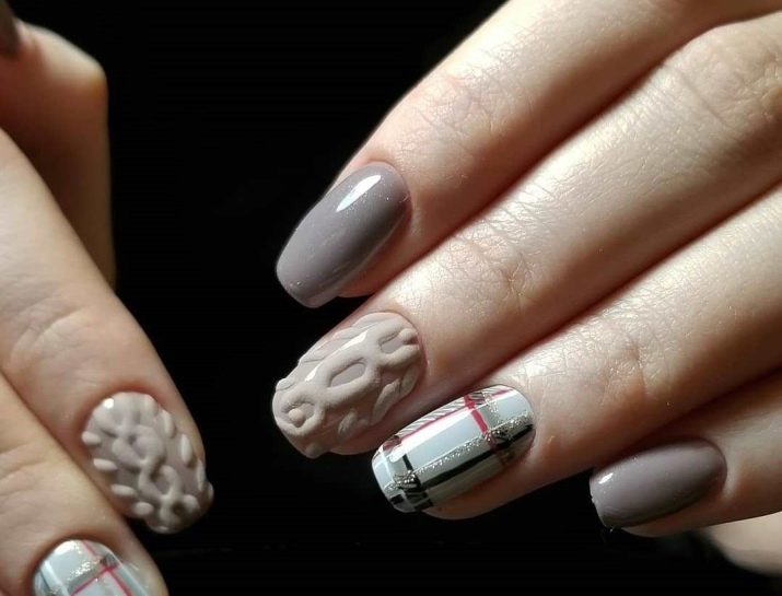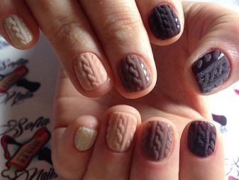 - Interessant nok ser flerfarvede “strikkede” negle interessant ud. Hvis du bruger grå, blå, lyserød, lys beige og hvid i dit design, får du en "velsmagende" kombination. Og forskellige tegninger på hver finger viser alsidigheden i udseendet til ejeren af en manikyr.