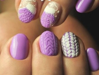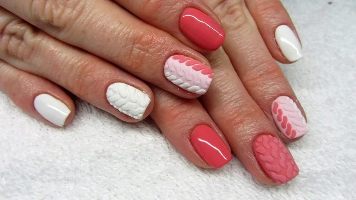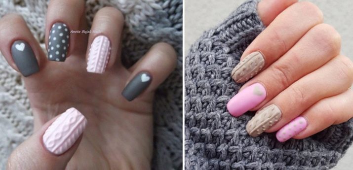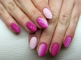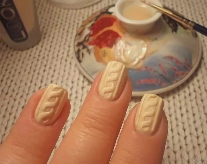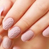 En manikyr med et "strikket" design kan gøres derhjemme. Der er flere måder at anvende volumetrisk ornament på.
