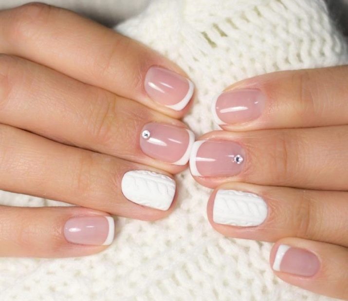 Strik kan være i forskellige farver, som du kan tænke på. Så i manikyr med dette element bruger de lignende nuancer. De fremspringende væv ser spektakulære ud, selv på den sort og snehvide version, det er nok at tilføje udsmykning i form af rhinestones, perler, akrylpulver, "crystal" chips.