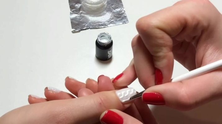- Strikning af fletninger på neglepladerne kræver koncentration og tid. For den perfekte manikyr skal du tegne elementerne omhyggeligt.