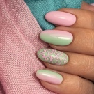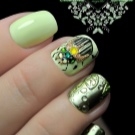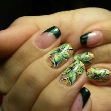 Den grønne base går godt med blade, grene og blomster. Især denne mulighed er velegnet til forår-sommerperioden. Mønstre på negle kan udføres i blomster nuancer.