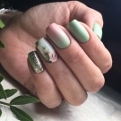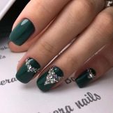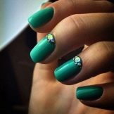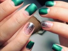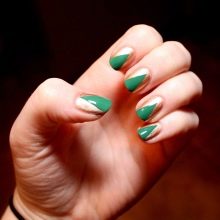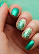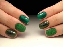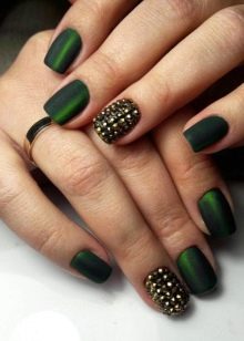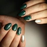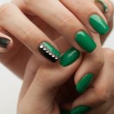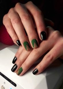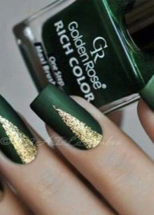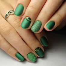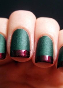 Manikyren i en kombination af basis af en matgrøn nuance med blanke ender ser højtidelig og usædvanlig ud. Følgende grønne nuancer er egnede til at skabe et festligt udseende: mørkegrøn, smaragd, kalk, sennep.