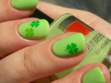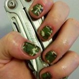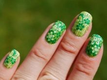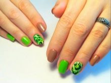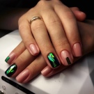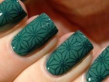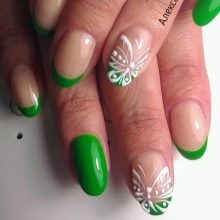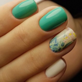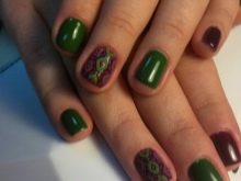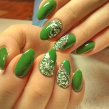 For foråret ville en perfekt løsning være en manikyr i grønt med billedet af blomster, planter, grene. Til efteråret er mørkere grønne nuancer egnede, og til vinteren kan du sikkert kombinere denne farve med røde nuancer.