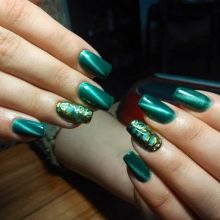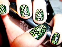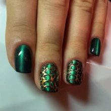 - Skaleret design er en original indretning, der ser smuk ud på udstrakte negle. Denne manikyr oprettes ved hjælp af smaragdfarvet folie. Han vil ikke efterlade nogen ligeglade, harmonisk kombineret med kjoler i smaragdskygger med gnister og rhinestones.