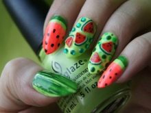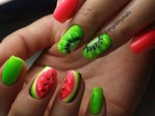 - Vandmelon - denne mulighed forekom relativt nylig. Det repræsenterer tegninger i form af en vandmelonskal på negle. Ringfingre er typisk dekoreret med en indvendig bærskåret med efterligning af frø.