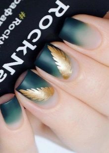 Blå og grønne farver betragtes som kolde nuancer. Men deres kombination giver dig mulighed for at opfinde mange eksklusive ideer til dekorering af negle. Marigolds med ombre vil se elegante ud, hvor den blå-sorte farve gradvist bliver til grøn. Og på ringfingeren kan du tegne et mønster af gylden lak.