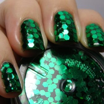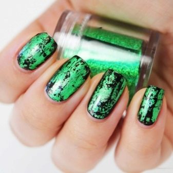 En strålende manikyr ser smuk ud mod en grøn baggrund.Du kan male neglene fuldstændigt i skinnende polsk, men du kan kun deres individuelle sektioner. For nylig har et sømdesign kaldet "brudt glas" vundet enorm popularitet. Til denne mulighed bruges folie, der skæres i stykker og lægges på neglen.