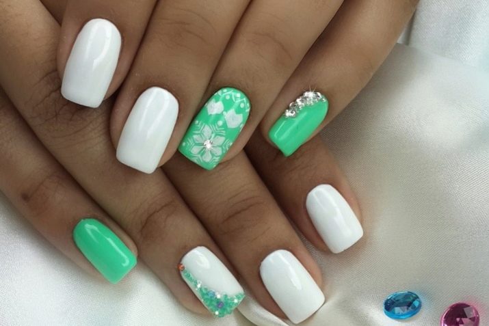 I en klassisk manikyr vil lysgrønne kombinationer med nuancer af pink eller nøgen, citron og blå være passende. Den mørkegrønne farve på lakken vil harmonisk kombinere med grå, sorte, gyldne og sølvlakker.