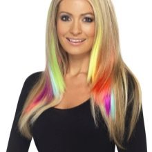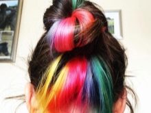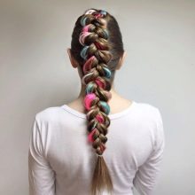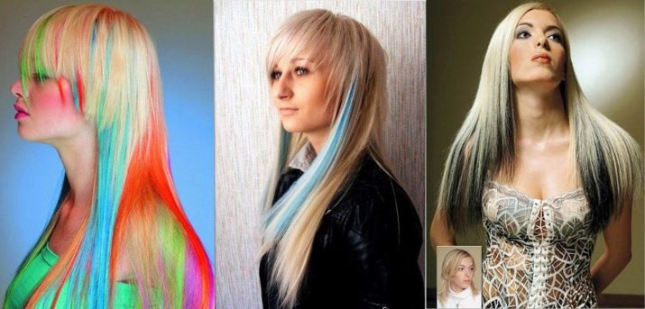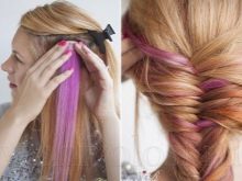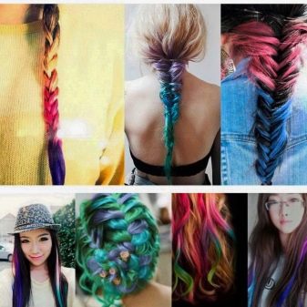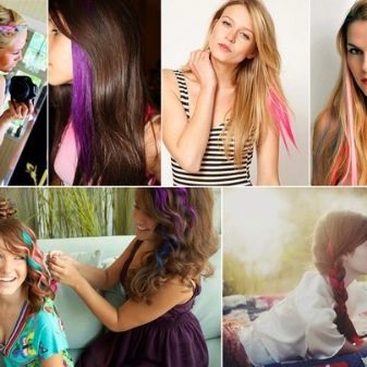 Lyse, iøjnefaldende lokker er tilgængelige, der passer perfekt til dit daglige look. Du kan bruge flerfarvede krøller i fletninger, da din egen farve er kombineret med en overhead og frisyren er meget harmonisk og smuk. Den anden anvendelse af farvede tråde er på løst hår.