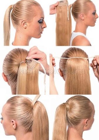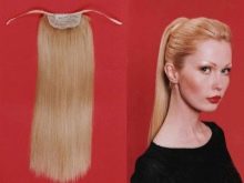 - Desuden kan falske hår sælges i form af en hale med et elastisk bånd eller en chignon med et slips.