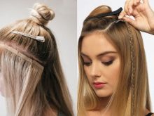 Falskt hår betragtes som en universel mulighed for modellering af frisurer, uanset deres længde. Den originale idé om at transformere langt, men sparsomt naturligt hår vil være at bruge overheadstrenge til at matche hovedfarven. For at oprette en frisure skal du lave en hale på bagsiden af hovedet og placere en ekstra indsats i midten af halen.Fra den resulterende volumetriske bjælke kan du flette en "fiskhale" eller en rygfletning, og strække strengene lidt langs væven for at skabe volumen.