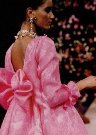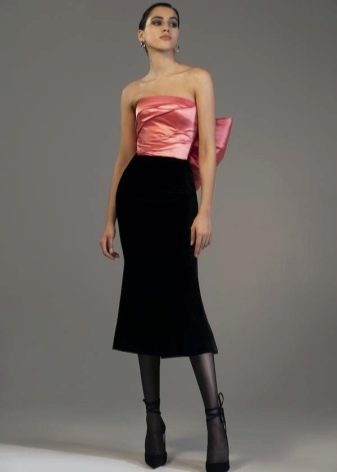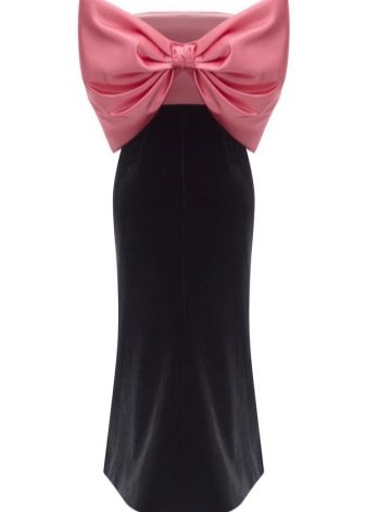 Vi taler om en kjole lavet af en satin lyserød top, som er fastgjort på bagsiden med en stor lyserød bue og en lang sort fløjlsskørt.