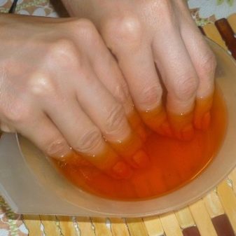 - Dyk fingerspidserne i løsningen. Tiden afhænger af formålet med begivenheden og varierer fra 10 til 30 minutter.Hvis proceduren udføres til terapeutiske formål, skal sådanne manipulationer gentages hver dag, indtil symptomerne på sygdommen forsvinder. Dette forekommer normalt inden for en måned.