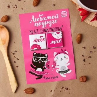 Det er også værd at være opmærksom på søde souvenirs. F.eks. Kan det være et chokoladehjerte, en kasse med slik, marshmallows eller marmelade i form af hjerter eller et lykønskningskort, hvori der er en lille chokoladebar.